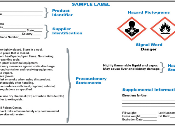 Labels are a condensed listing of the hazards of that chemical. The GHS sets the standard for what information is required to be on the label. All chemical containers from the manufacturer are required to have a GHS compliant label on them. However, we often transfer some of the chemical into a smaller, secondary container. We must apply a label to these as well.